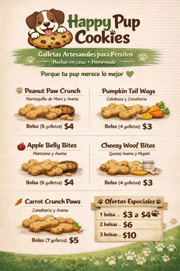 En Happy Pup Cookies, nos dedicamos a ofrecer galletas artesanales saludables para perros que promueven el bienestar de nuestras mascotas. Creemos que cada perro merece disfrutar de un delicioso premio hecho con amor y cuidado.